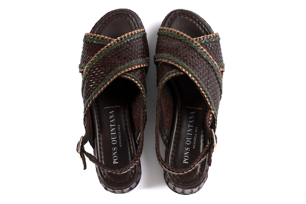 Sandalia de plataforma Forli realizada en piel trenzada a mano color café en combinación con musgo y metal oassi. Pala cruzada. Cierre mediante hebilla en el tobillo. Plataforma forrada de piel trenzada a tono. Piso de goma antideslizante. Altura delantera 3,5 cm y trasera 4,5 cm. PONS QUINTANA
