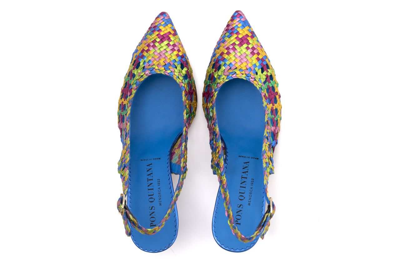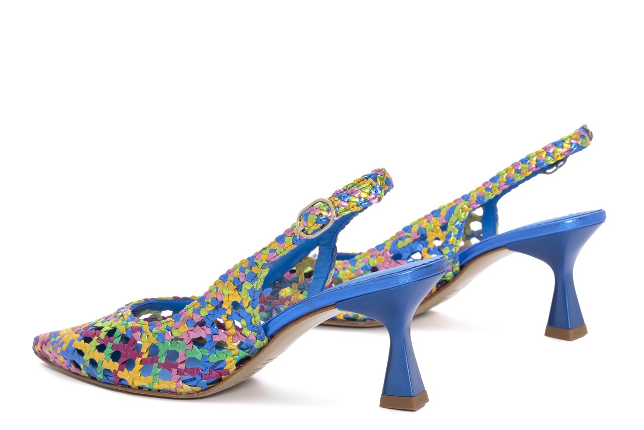 Sandalia MORITZ realizada en piel trenzada a mano color metal electric, malva, fuxia, menta y mostaza. Acabado en punta. Tacón pintado a tono. Suela de cuero. Altura tacón 7 CM. PONS QUINTANA