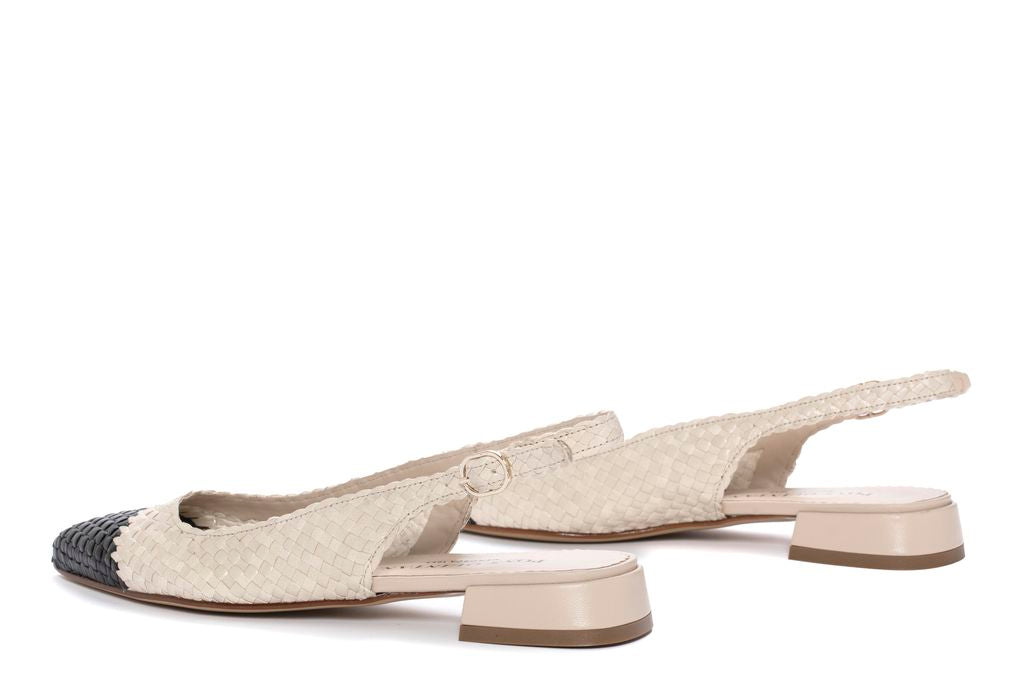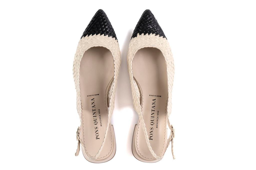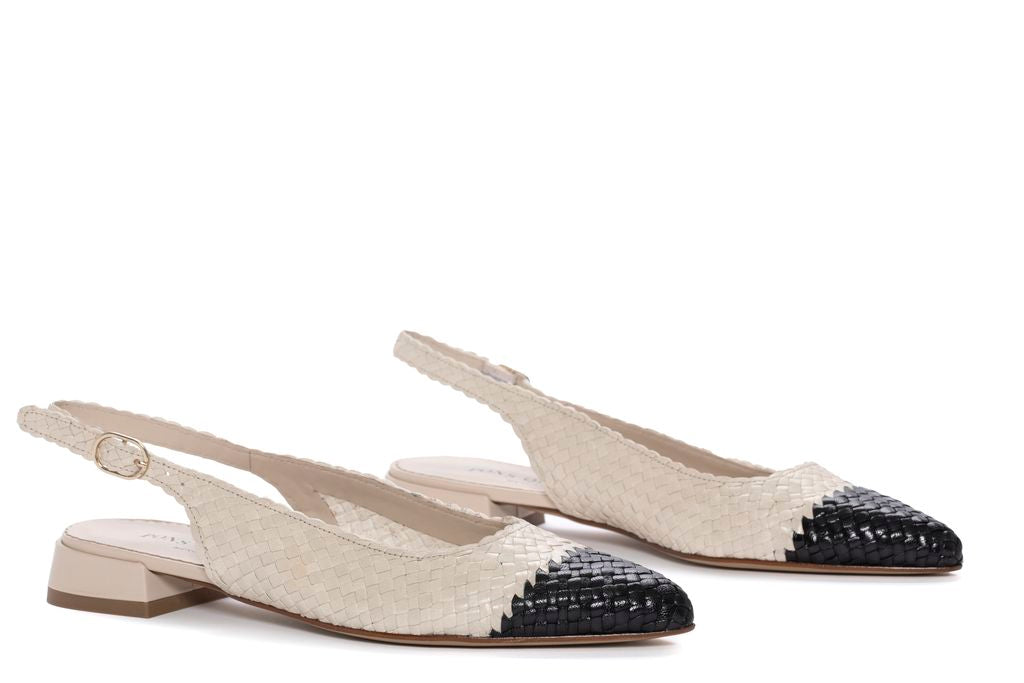 Sandalia plana Sonia realizada en piel wet trenzada a mano color salinas con la punta en negro. Acabado en punta. Cierre mediante hebilla en el tobillo. Altura tacón 1,5 cm.