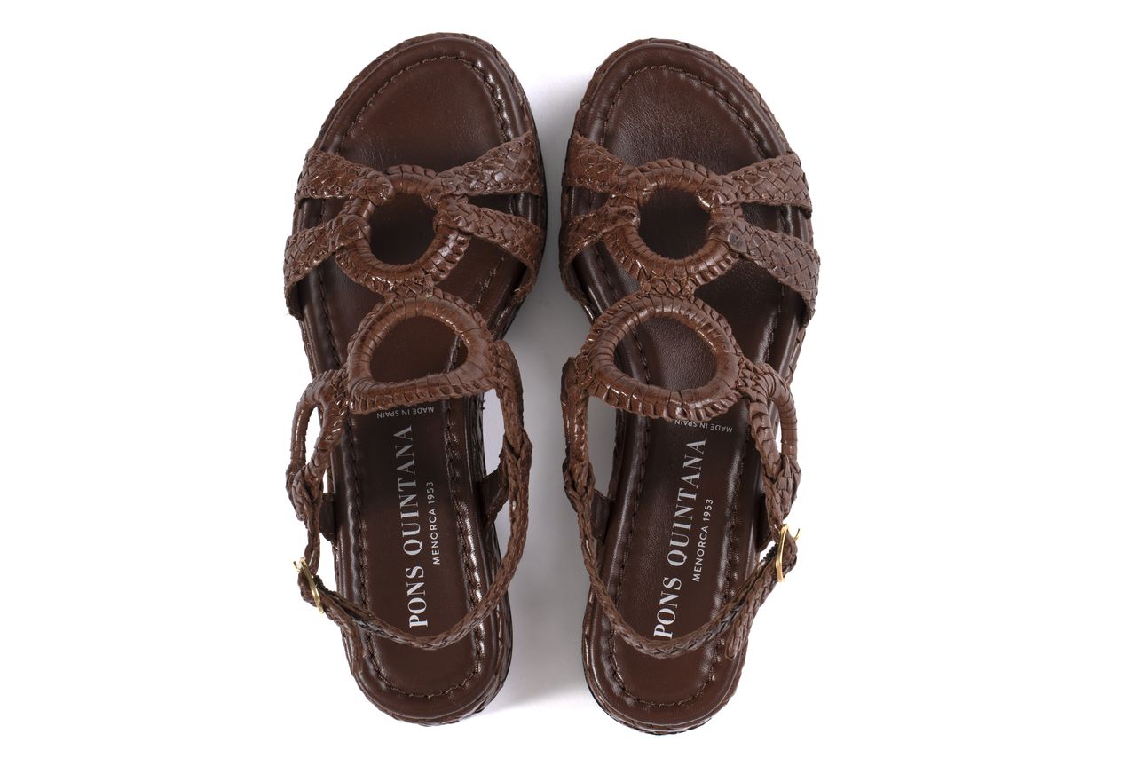 Sandalia de plataforma Forli en piel trenzada a mano color caoba. Plataforma en piel trenzada a tono.Cierre mediante hebilla en el tobillo. Suela de goma antideslizante. Altura delantera 3,5 cm y trasera 4,5 cm. PONS QUINTANA.