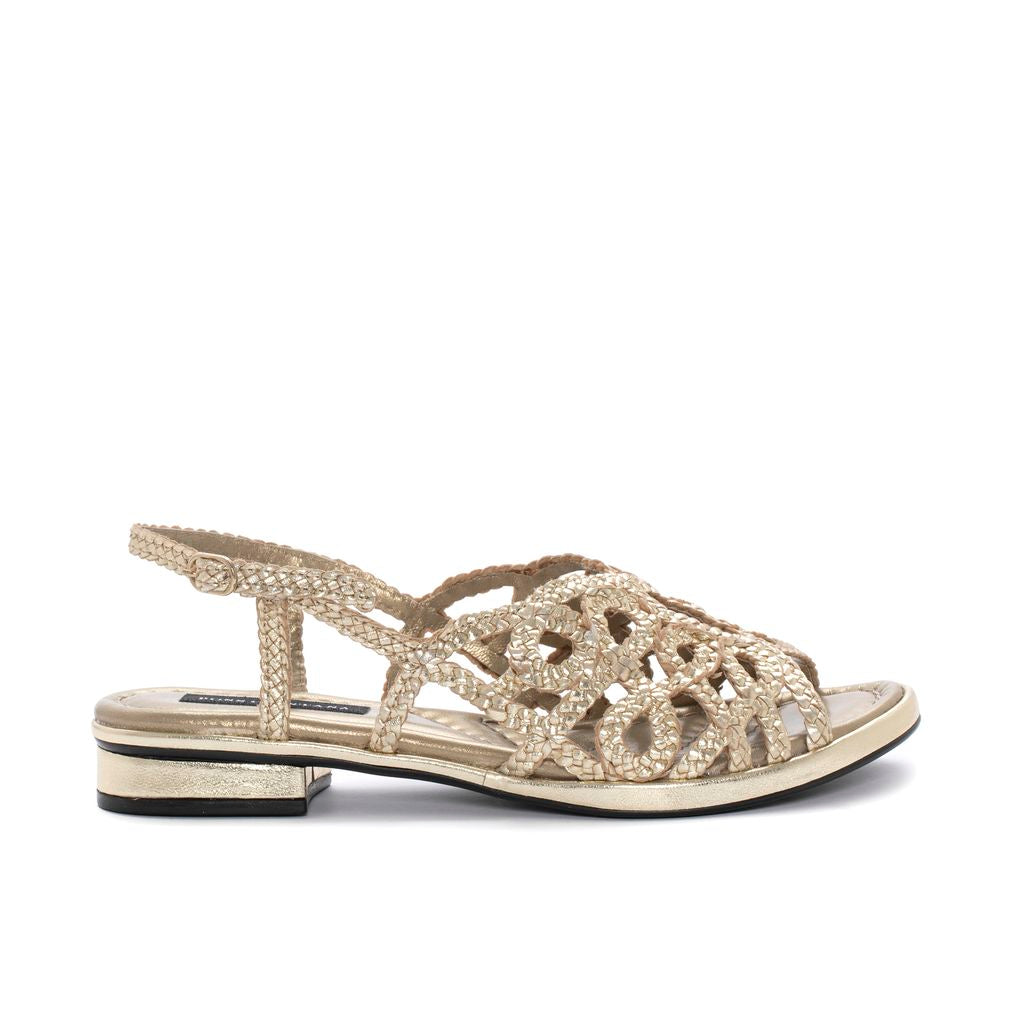 Sandalia plana Diana realizada en piel trenzada en un elegante color metal platino. Cierre mediante hebilla. Plantilla acolchada para máximo confort a tono. Piso de goma antideslizante. Altura tacón 2,5 cm. Su diseño con diferentes tiras envolventes proporciona un ajuste elegante y estilizado, realzando la silueta del pie. PONS QUINTANA