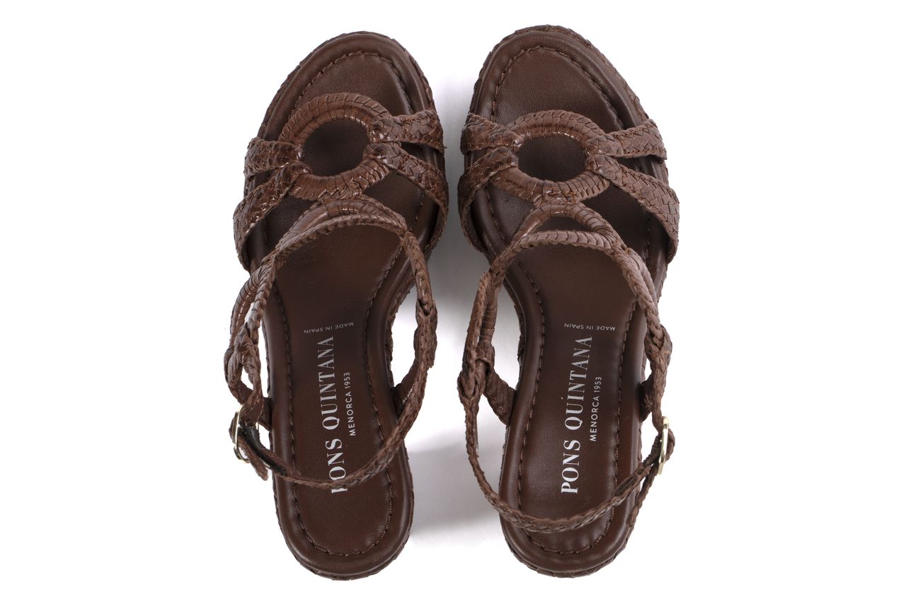 Sandalia de tacón Génova realizada en piel trenzada a mano color caoba.Exclusivo diseño a tono con diversas tiras que envuelven el pie, con adornos circulares laterales y sobre empeine. Cierre mediante hebilla en tobillo. Tacón trenzado forrado a tono. Altura tacón 11,5 cm, altura plataforma 3,5 cm. Ideal para acompañarte en tus eventos más especiales. PONS QUINTANA