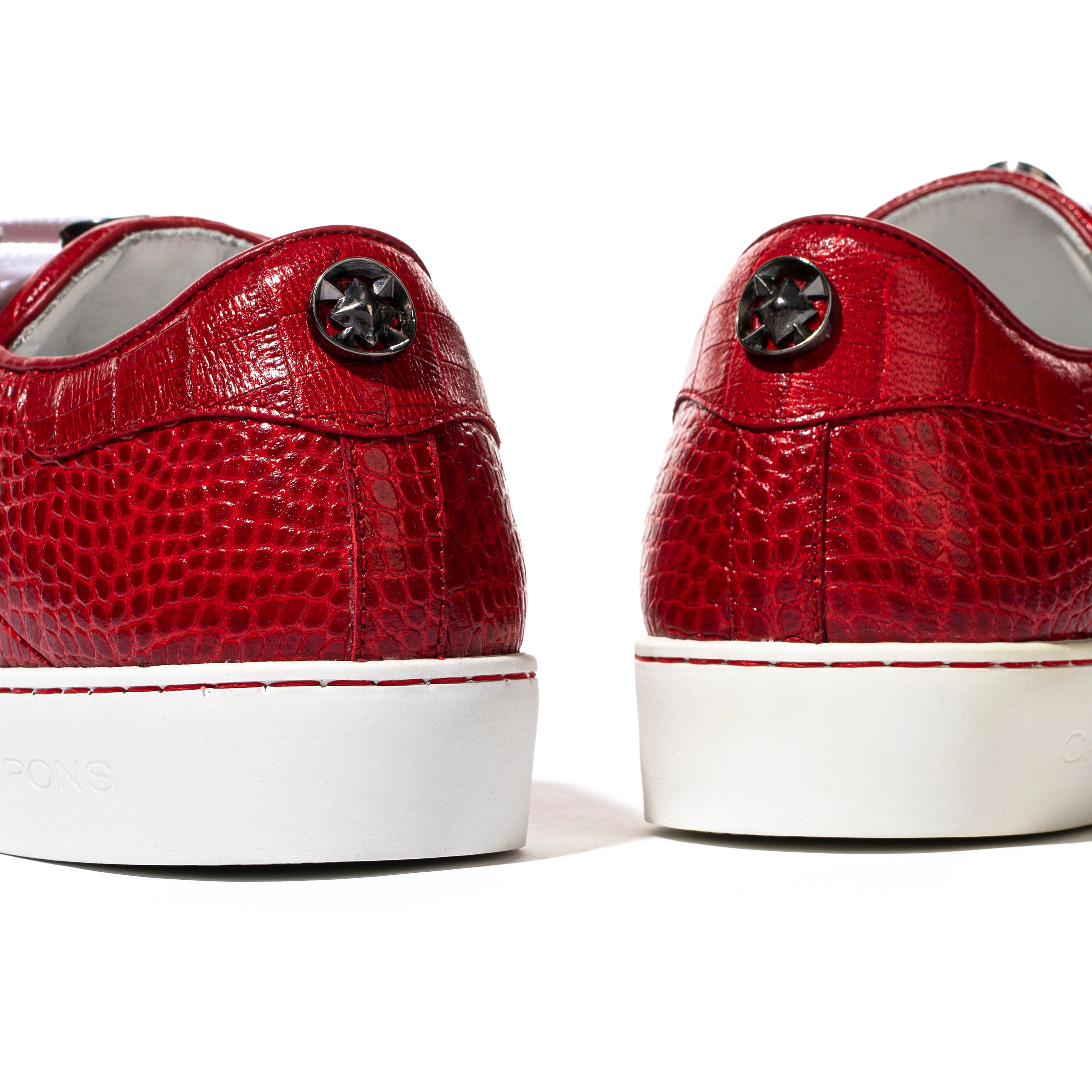 Sneaker tècnica realitzada en pell efecte cocco de color vermell. Tancament ajustable amb cordons. Adorns metàl·lics del logotip de Carlos Pons al darrere i llengüeta. Sola blanca amb gravat lateral del nom de la marca. Una sneaker pensada per a la teva comoditat amb plantilla ortopèdica i extraïble per reduir la fatiga en caminar.