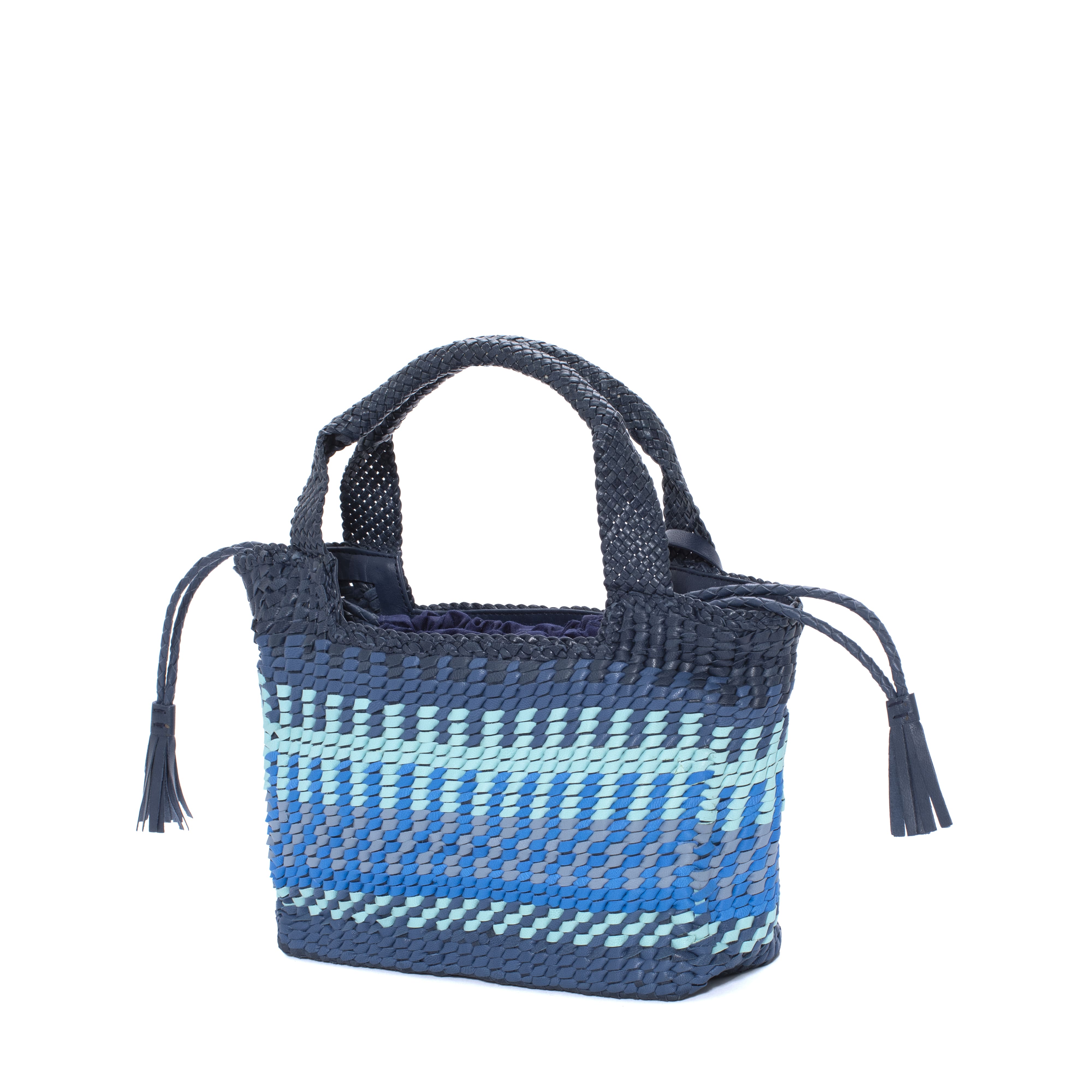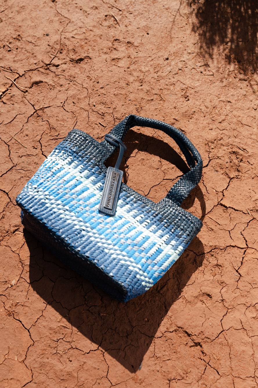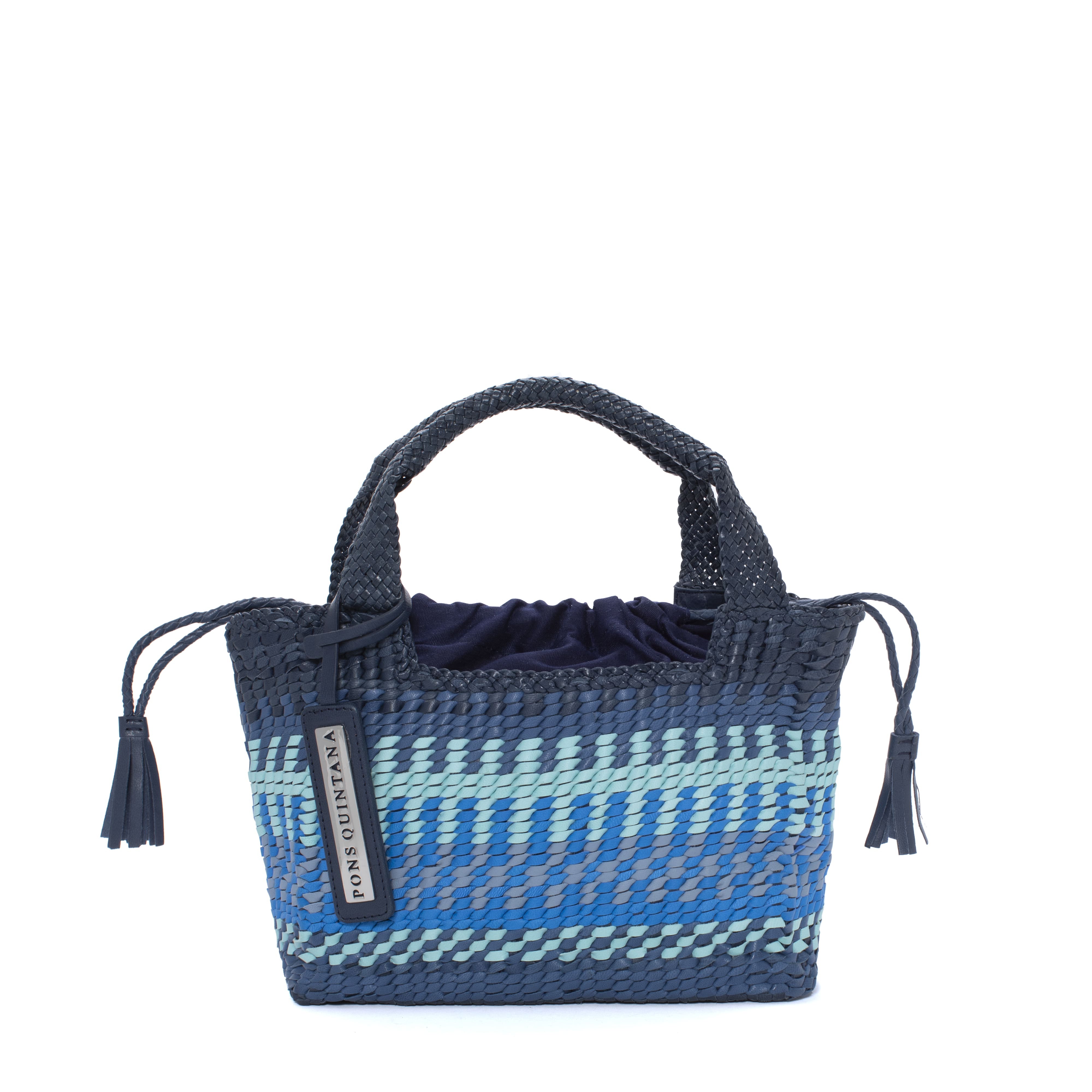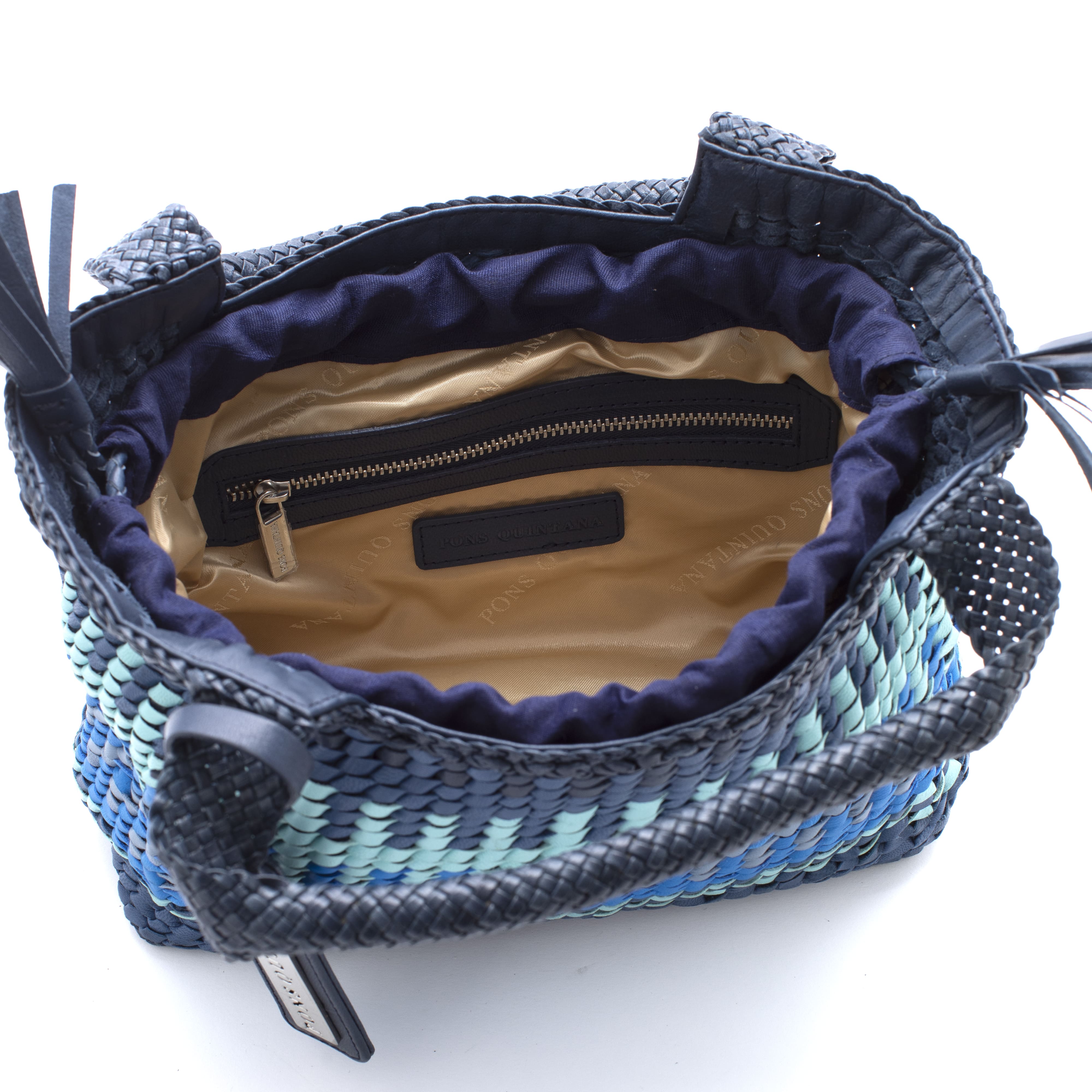 Bossa de mà amb pell trenada a mà amb combinacions de diferents colors combinant tonalitats de blau. Folre tèxtil tipus sac. Nansa a to. Forma suau i emmotllable amb detall de xapa amb el logotip de la marca. PONS QUINTANA