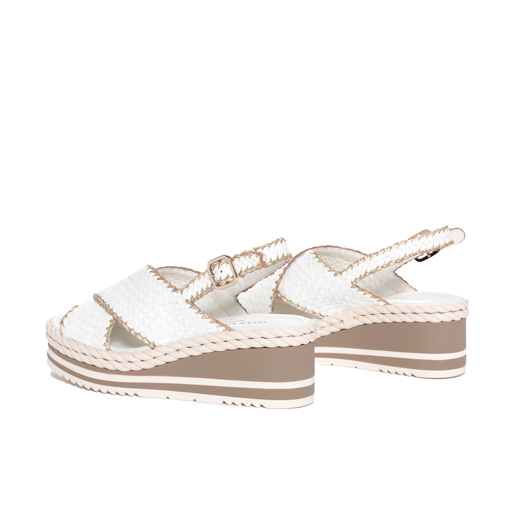 PADOVA platform sandal in wet milk color hand-braided leather. Buckle closure at the ankle. Tubular rope effect around the platform. Matching two-tone floor. Non-slip rubber sole. Front height of 4 cm and rear height of 6.5 cm. Wet leather is much softer since it is chrome-free and has a natural tanning without iron stains, which helps to significantly reduce the impact on the environment. PONS QUINTANA