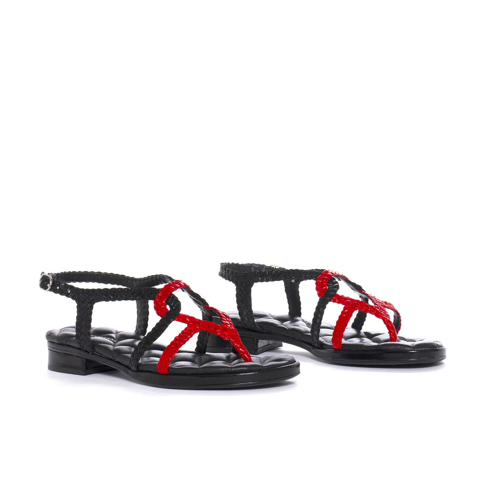 DIANA flat sandal made of hand-braided leather in black. Semi-round toe finish. Upper with various strips around the foot, some cherry colored. Buckle closure at the ankle. Non-slip rubber floor. Matching braided insole. Height 2.5 cm. PONS QUINTANA