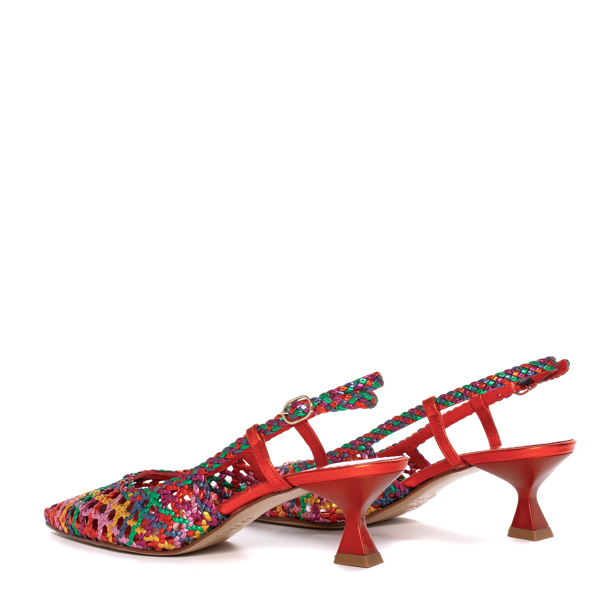 Zapato de tacón Carol tipo salón en piel trenzada a mano metal multicolor orange, verde, azzurro, lemon y malva. Acabado en punta. Cierre mediante hebilla en el tobillo. Altura tacón 4,5 cm. PONS QUINTANA