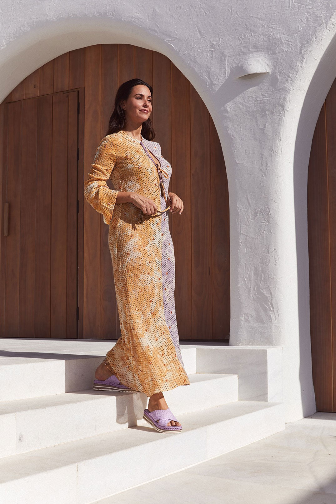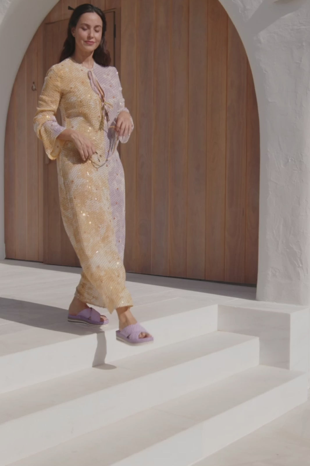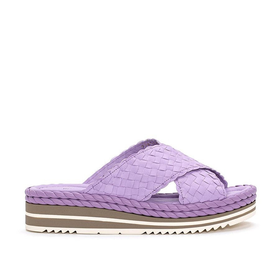 MILAN platform sandal made in lavender hand-braided wet leather. Tubular rope effect. Bicolor tone-on-tone sole. Non-slip rubber sole. Front height 3 cm and back height 4,5 cm. The wet leather is much softer as it is chrome free and has a natural tanning without iron stains, which helps to significantly reduce the impact on the environment.