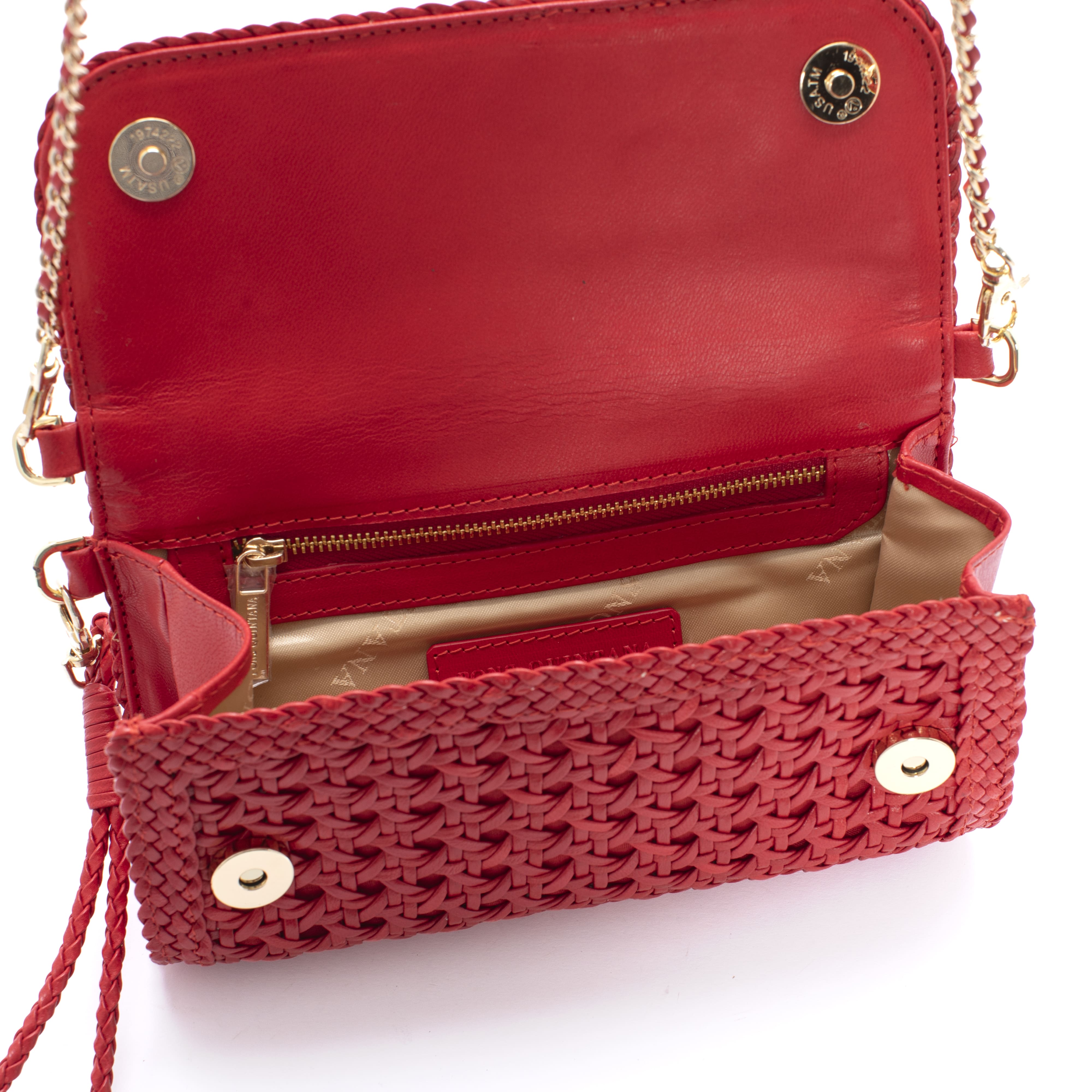 Handbag made of cherry-colored hand-braided leather. Textile lining. Interior zipper pockets. Matching handle. Sheet metal detail with the brand logo. PONS QUINTANA