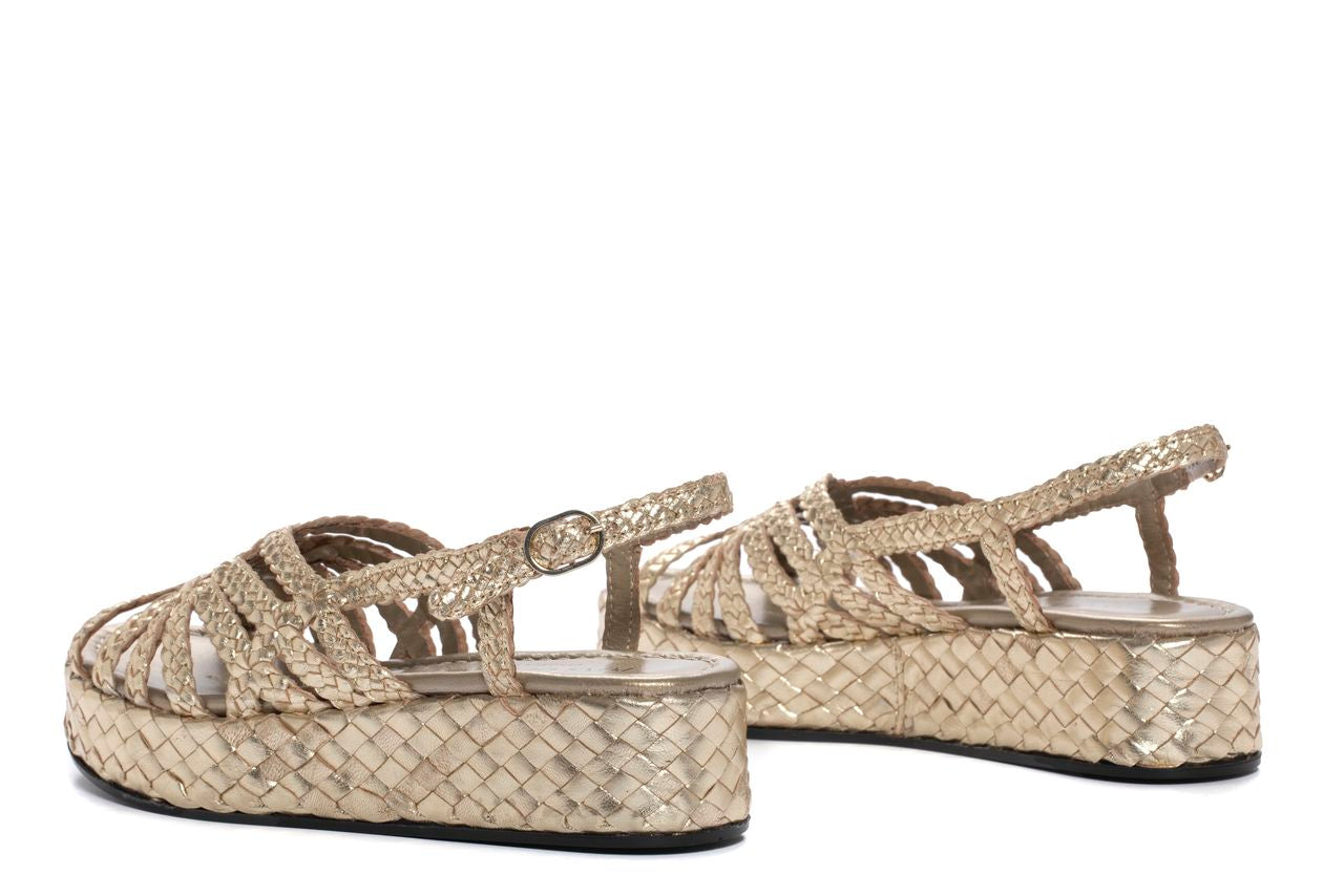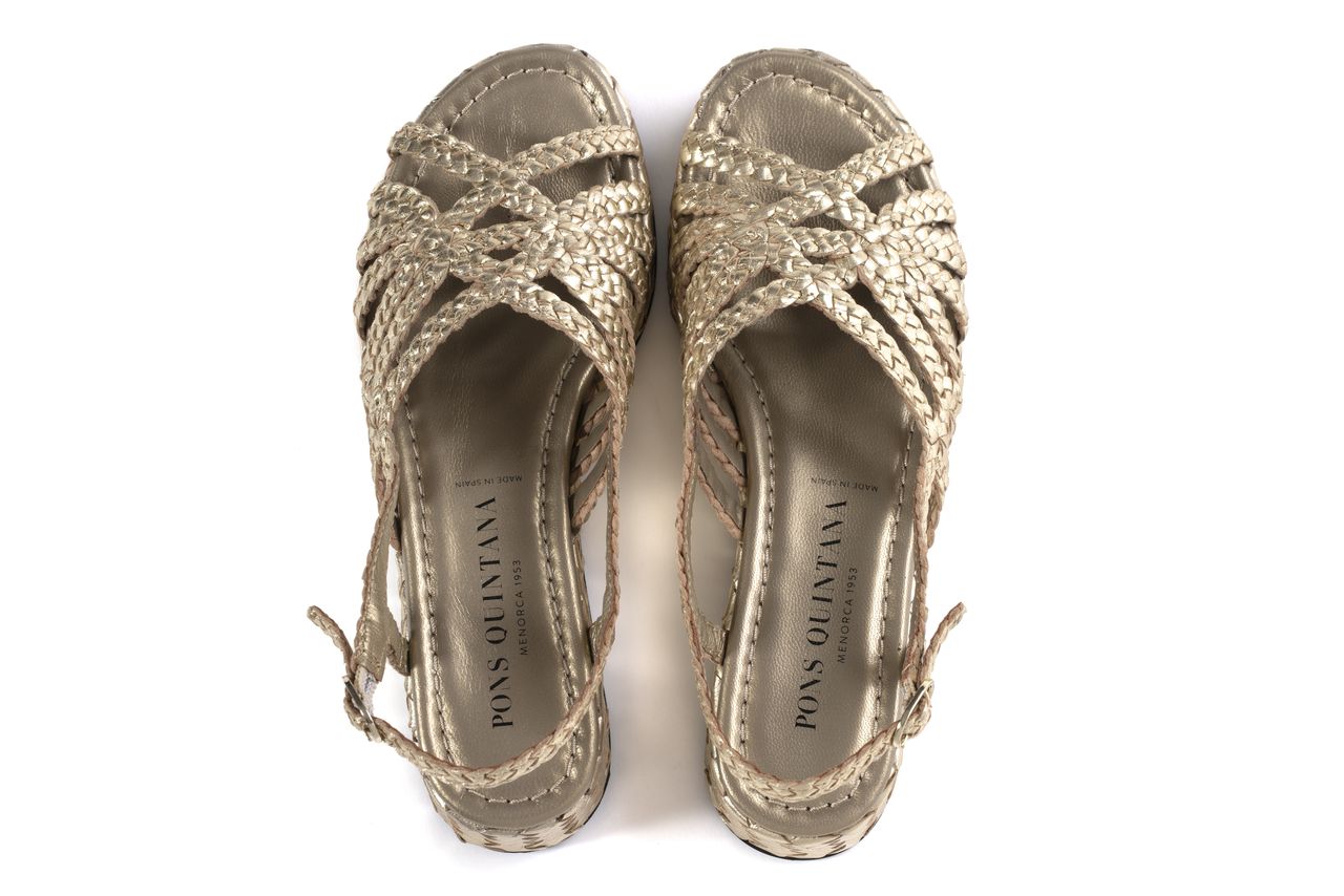 Forli platform sandal in hand-braided leather in an elegant platinum metallic color. Matching braided leather platform. Buckle closure at the ankle. Non-slip rubber sole. 3.5 cm front and 4.5 cm rear height. Its design with different wraparound straps provides an elegant and streamlined fit, enhancing the silhouette of the foot. PONS QUINTANA