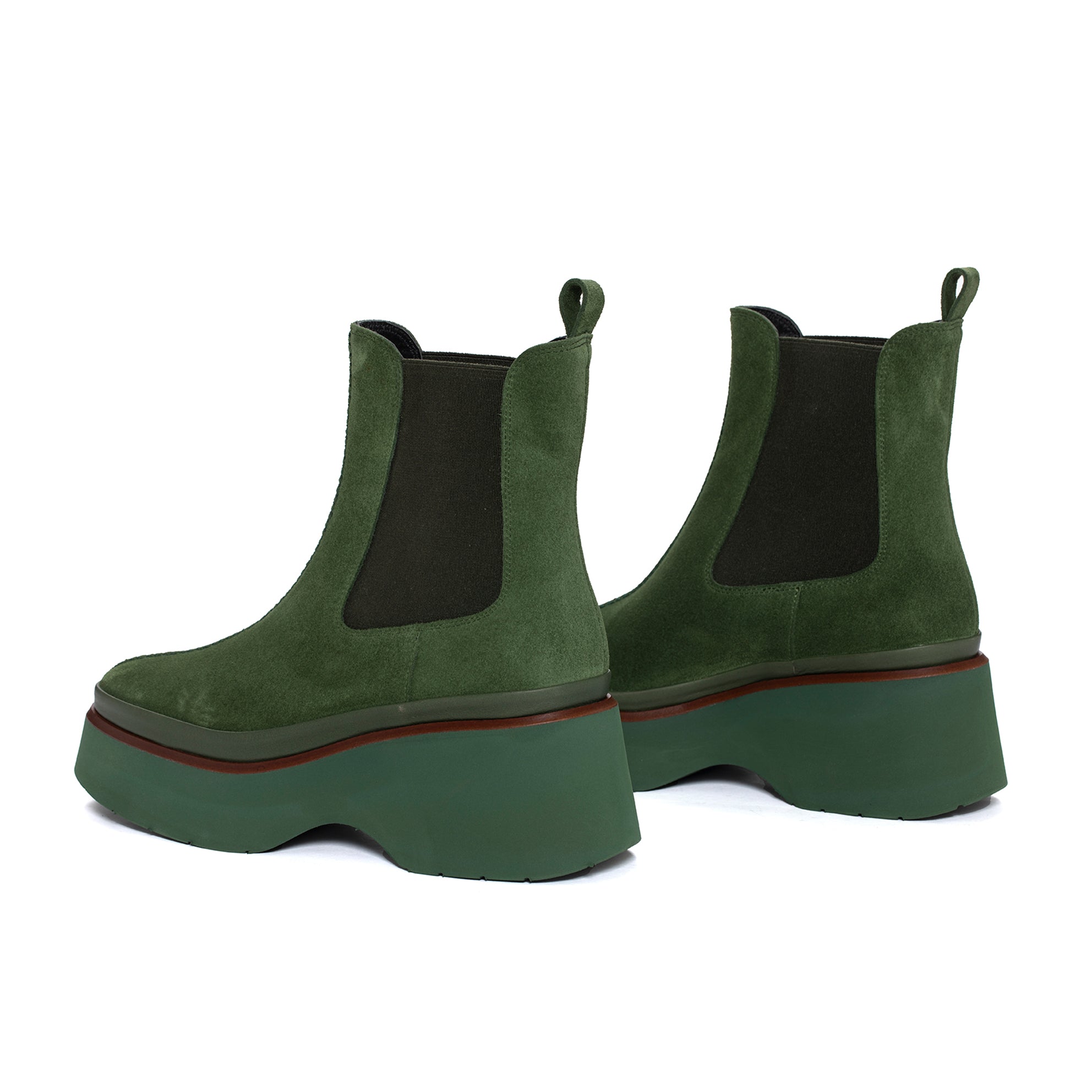 Botin de plataforma Raquel tipo Chealse en piel velour color musgo. Punta redonda y adorno de pespunte a tono sobre empeine. Cierre mediante elástico lateral. Tirador trasero para facilitar el calce. Plataforma extra ligera a tono. Suela extra ligera de goma antideslizante a tono. Altura de 4 cm. Unidades limitadas. PONS QUINTANA