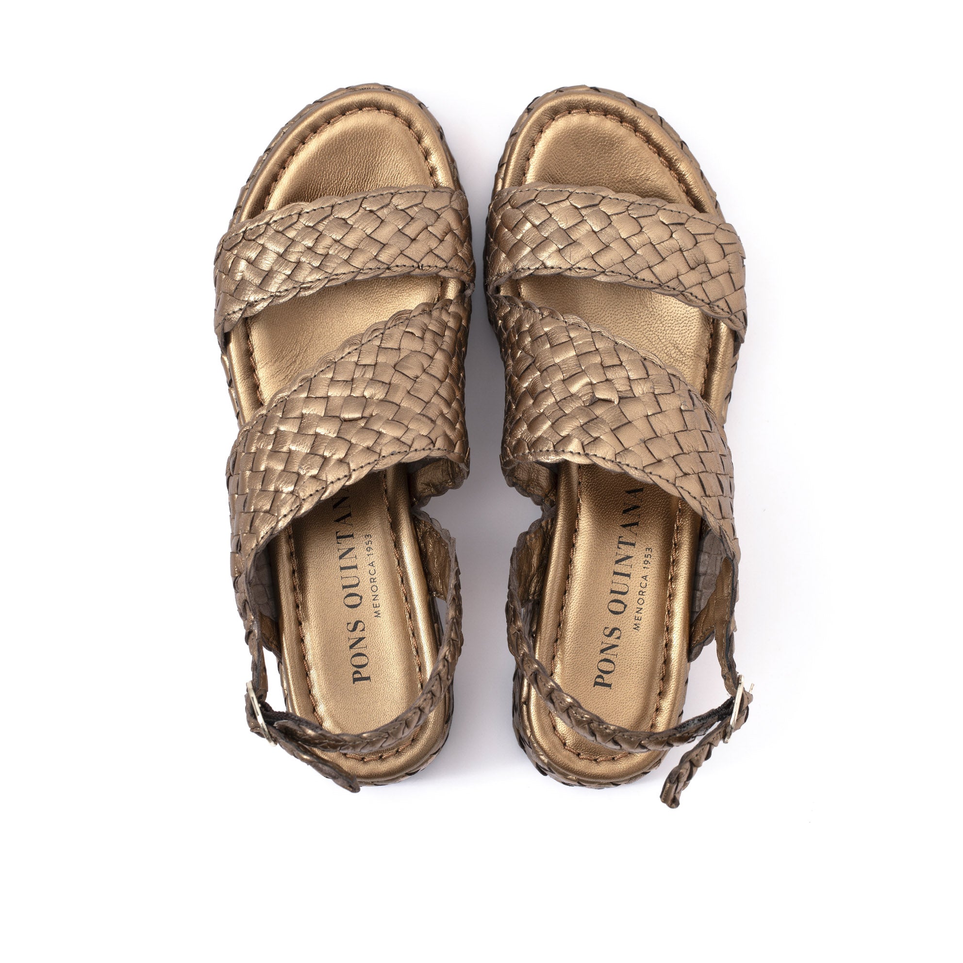Sandalia de plataforma FORLI en piel trenzada a mano color metal Oassi. Cierre mediante hebilla en el tobillo. Plataforma forrada de piel trenzada a tono. Piso de goma antideslizante. Altura delantera 3,5 cm y trasera 4,5 cm. PONS QUINTANA