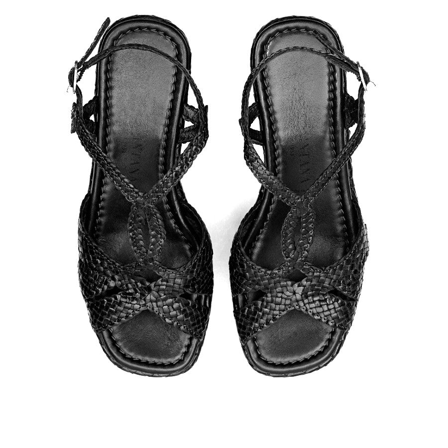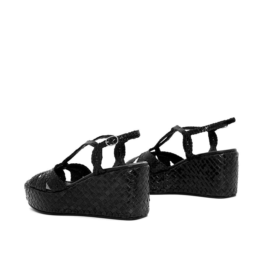 Sandalia de plataforma ANKARA confeccionada en piel trenzada a mano color negro. Cierre mediante hebilla en el tobillo. Acabada en punta cuadrada. Piso forrado en piel trenzada a tono. Altura plataforma 7,5 cm y plataforma 3,5 cm.