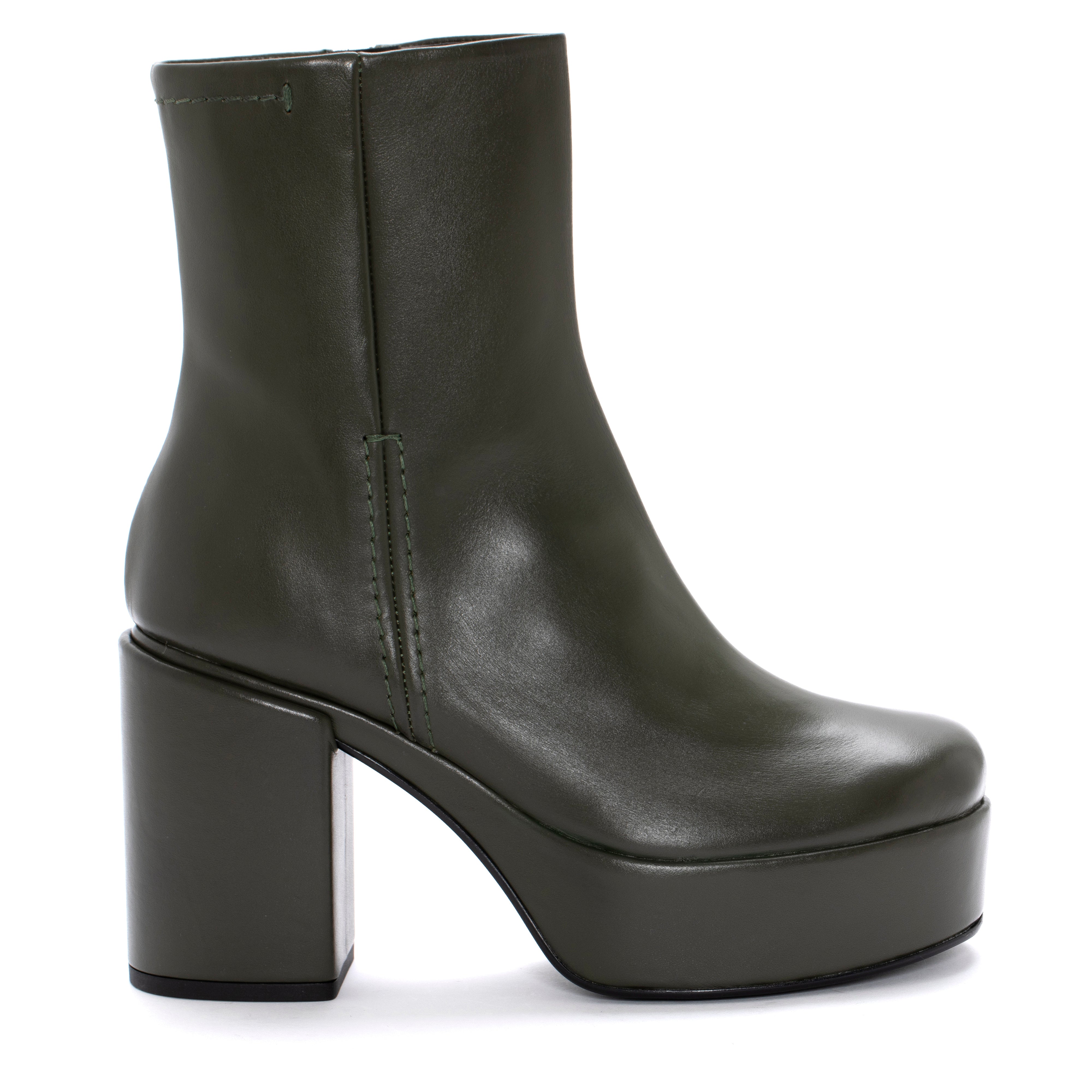 Botín de tacón KANSAS confeccionado en piel sugar color bosque. Acabado en punta redonda. Cierre mediante cremallera lateral interna. Tacón y plataforma forrados de piel a tono. Altura tacón 8 cm y plataforma 4 cm. KANSAS evoca al estilo retro de los años 60 por su voluminosa plataforma. PONS QUINTANA