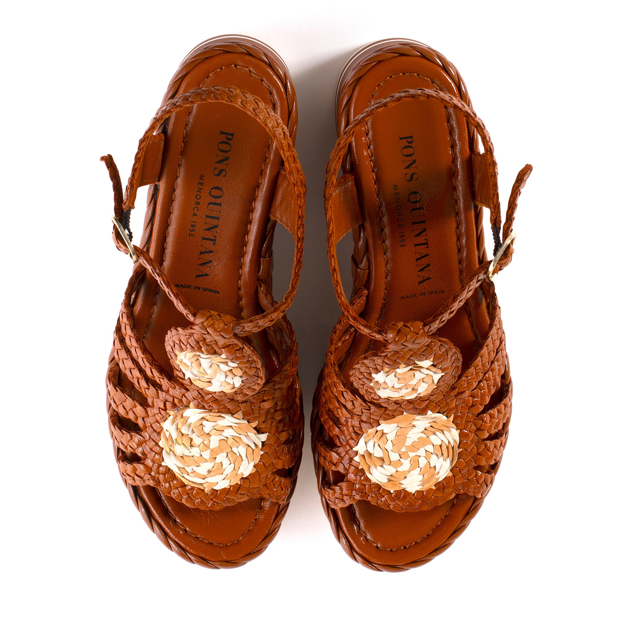 Sandalia de plataforma PADOVA en piel trenzada a mano color toffe y marfil Cierre mediante hebilla en el tobillo. Tubular de efecto cuerda alrededor de plataforma. Piso bicolor a tono. Suela de goma antideslizante. Altura delantera de 4 cm y trasera de 6,5 cm. PONS QUINTANA
