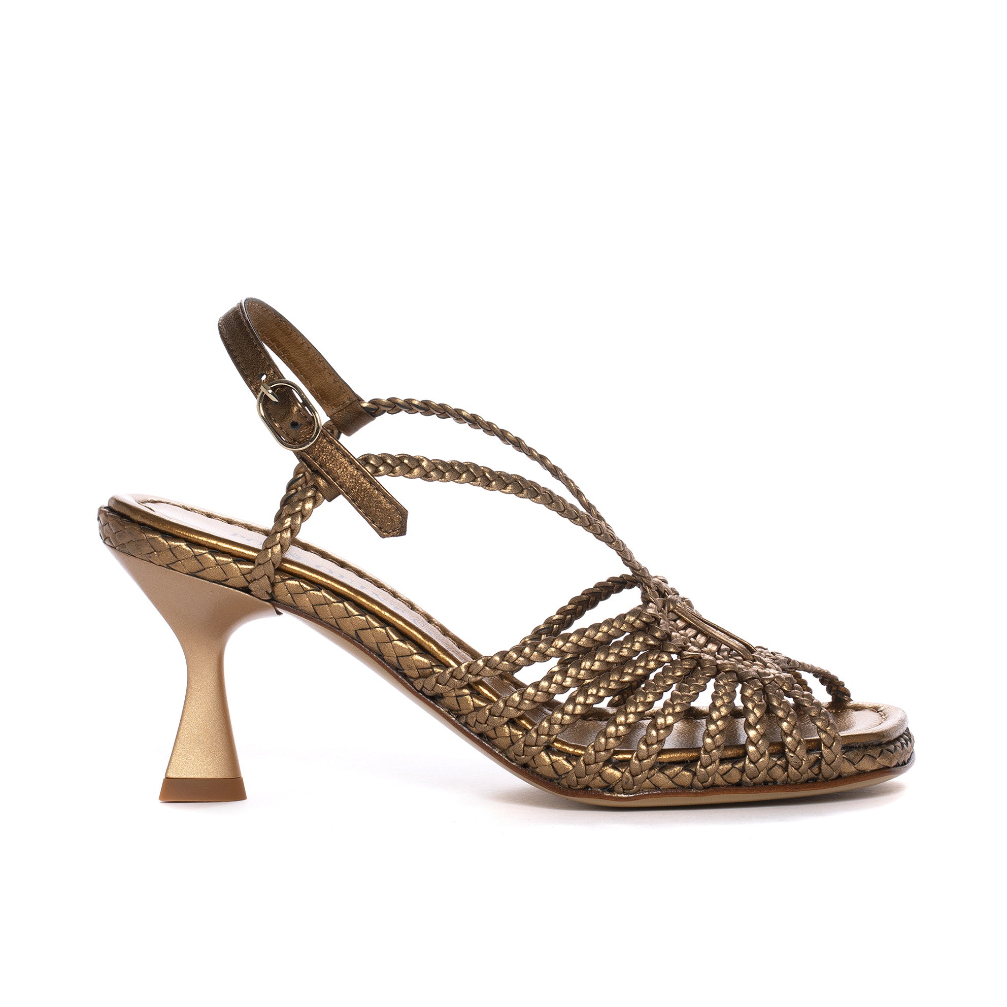 Sandalia de tacón FIJI en piel trenzada a mano color metal oassi. Acabado en punta cuadrada. Cierre mediante hebilla en el tobillo. Suela de cuero. Tacón pintado a tono. Altura tacón 7 cm. PONS QUINTANA