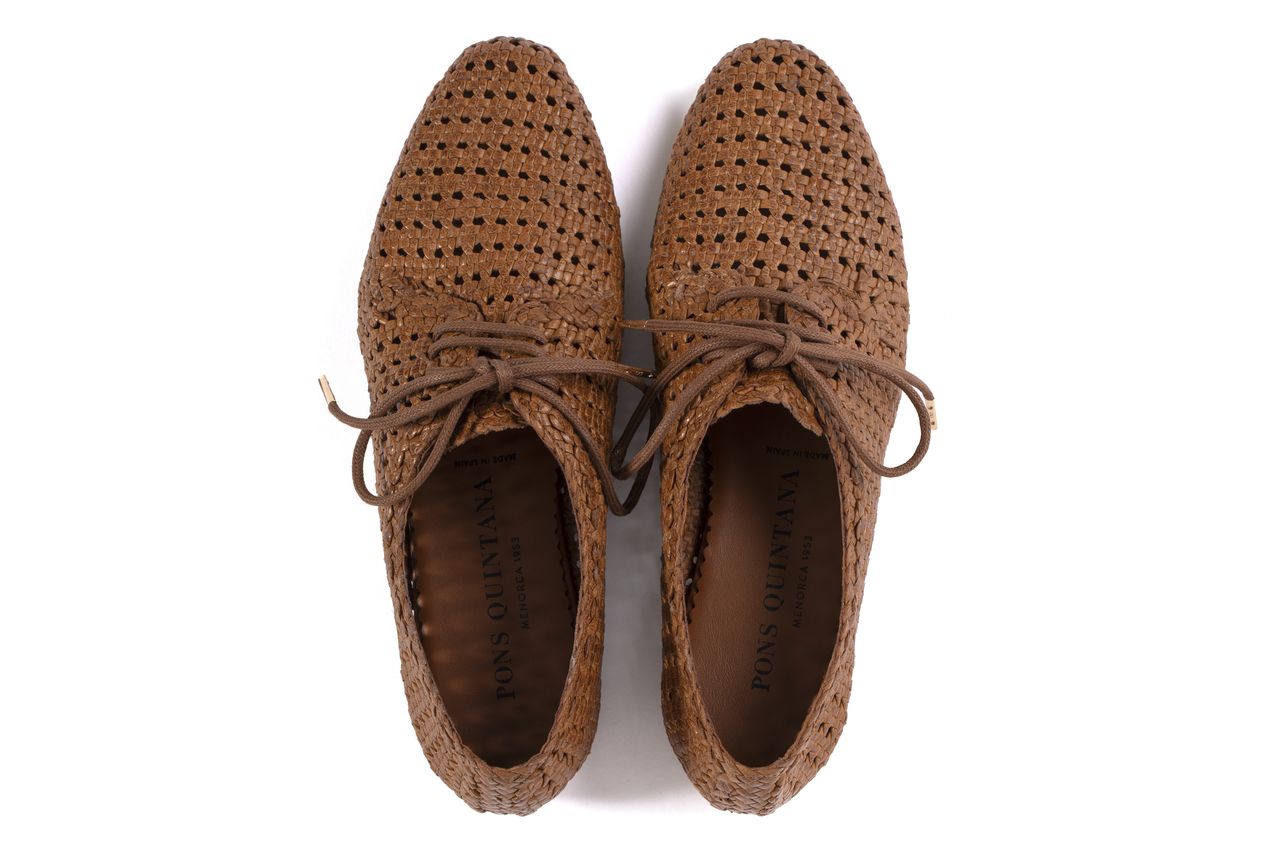 Zapato plano Pisa confeccionado en piel trenzada a mano color toffe. Cierre mediante cordones. Acabado en punta redonda. Suela de cuero. Altura de 1 cm. Su construcción abierta permite una excelente ventilación, ideal para los días cálidos. PONS QUINTANA